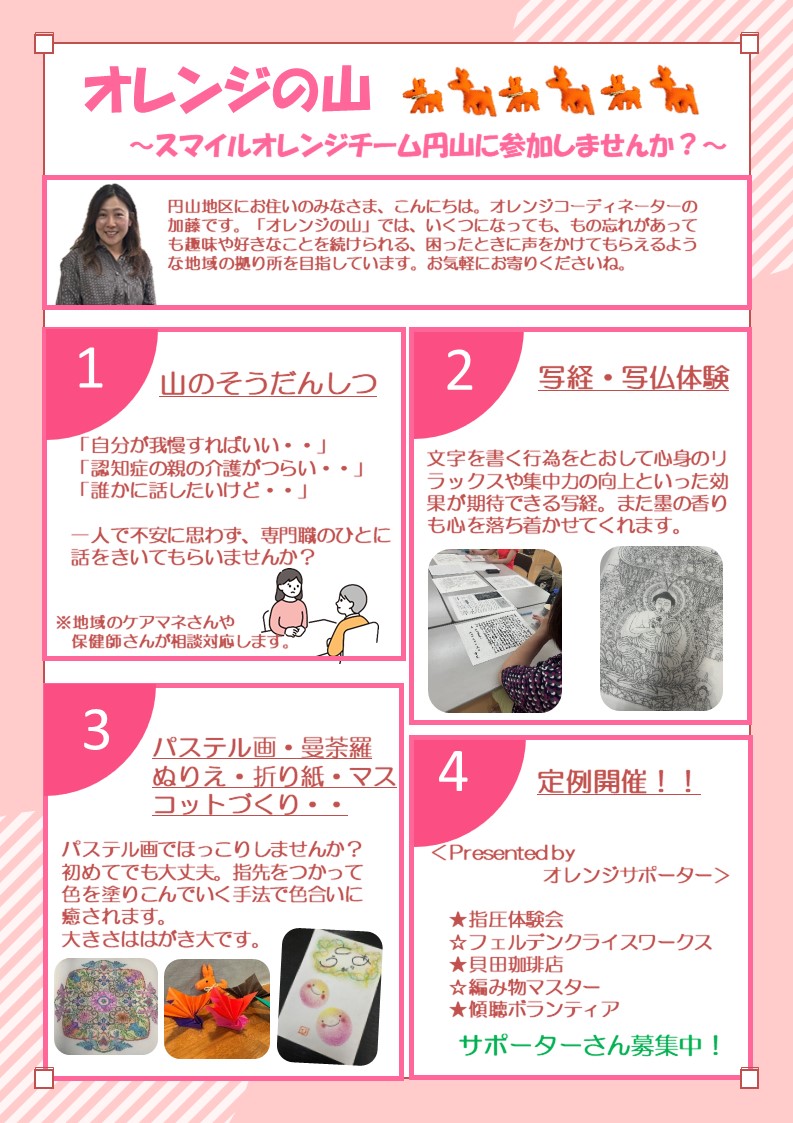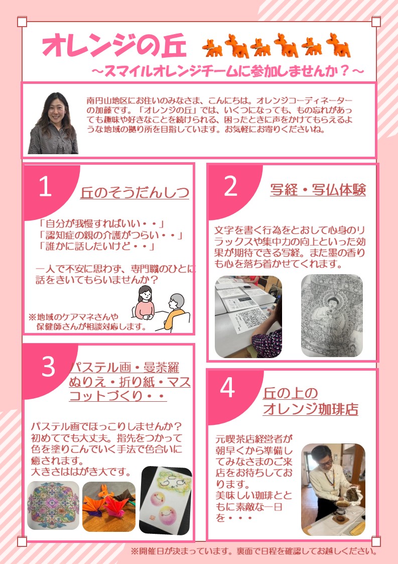 🍊️スマイルオレンジチームは、物忘れが気にかかるようになっても住み慣れた地域で希望をもって暮らし続けることができるように、認知症のある方やご家族、共に支え合うオレンジサポーター、地域の方々が集い、様々なことに取り組める地域の【ヨリドコロ】を目指しています。「最近物忘れが心配だわ」と感じている方、一人で不安に思わず一緒に楽しくおしゃべりしませんか?折り紙・マンダラ塗り絵・数独・編み物・マスコットづくり・カラオケ・・・。美味しい挽き立て珈琲を淹れて、お待ちしております。