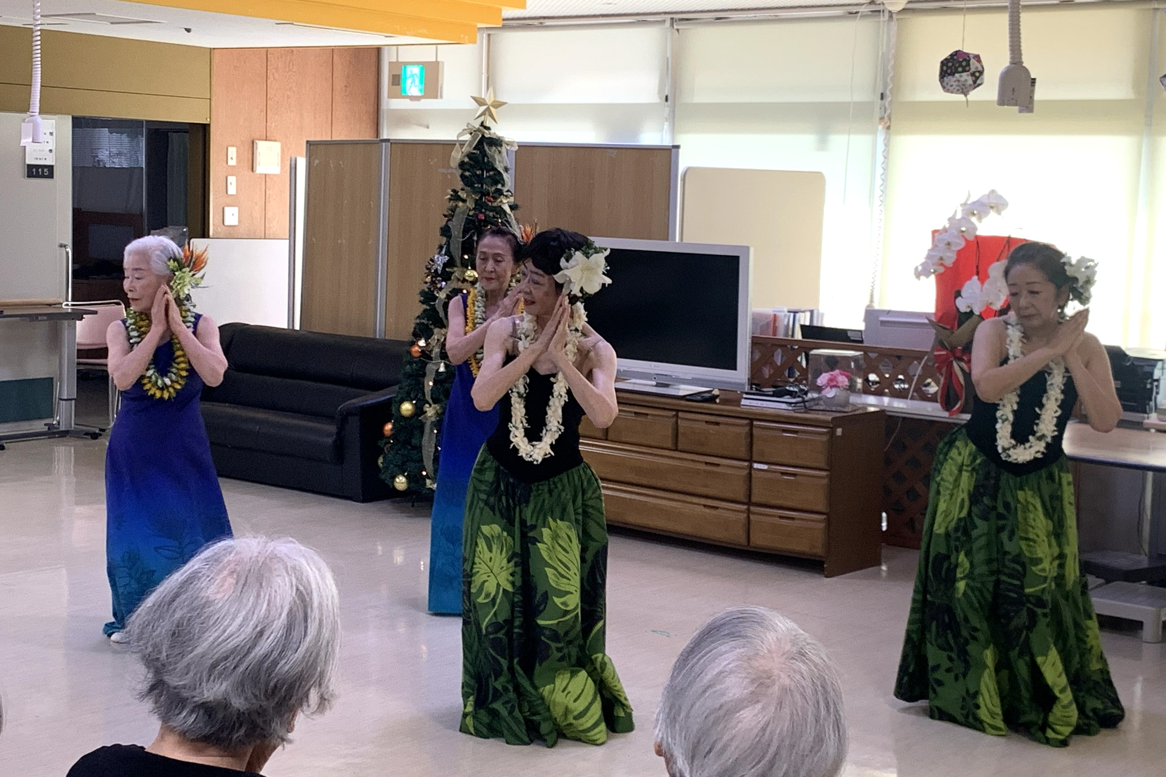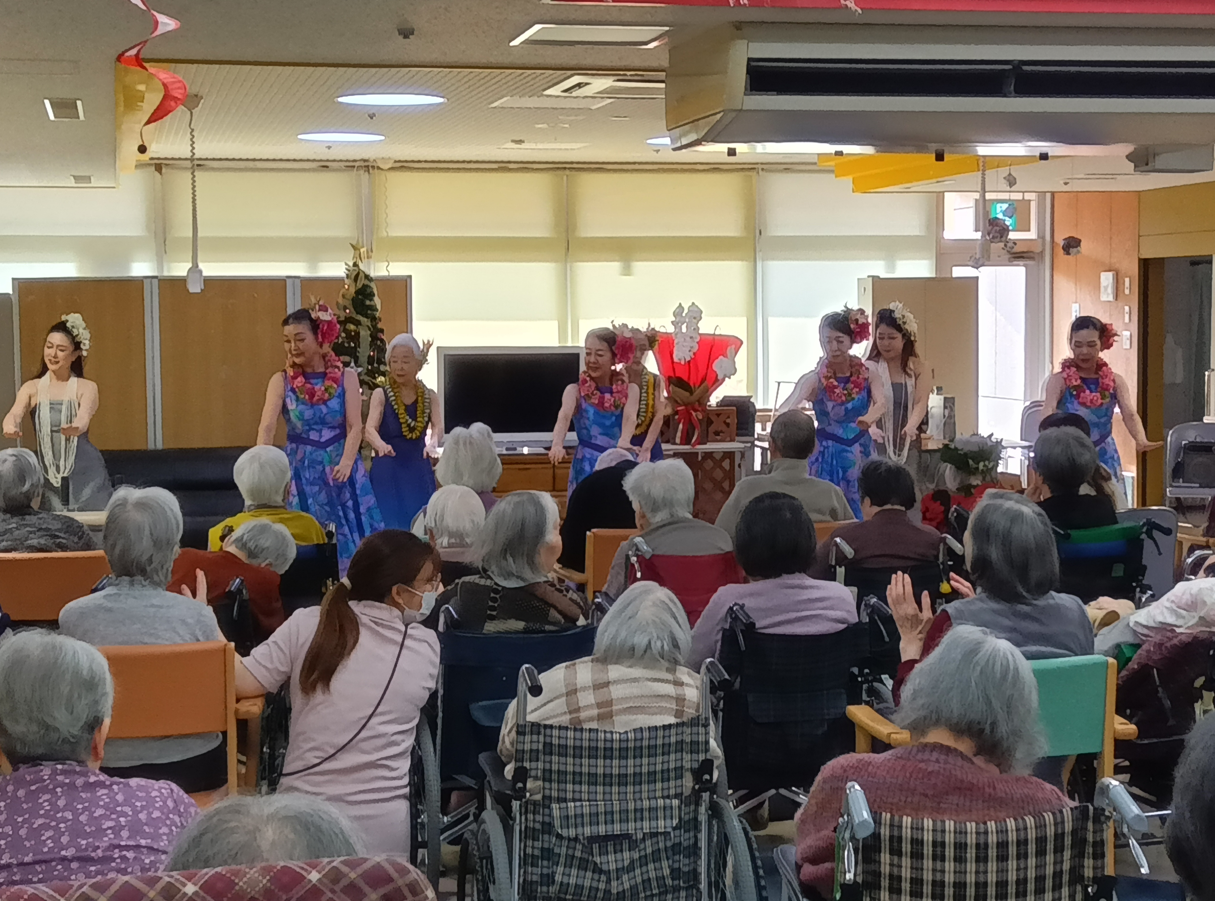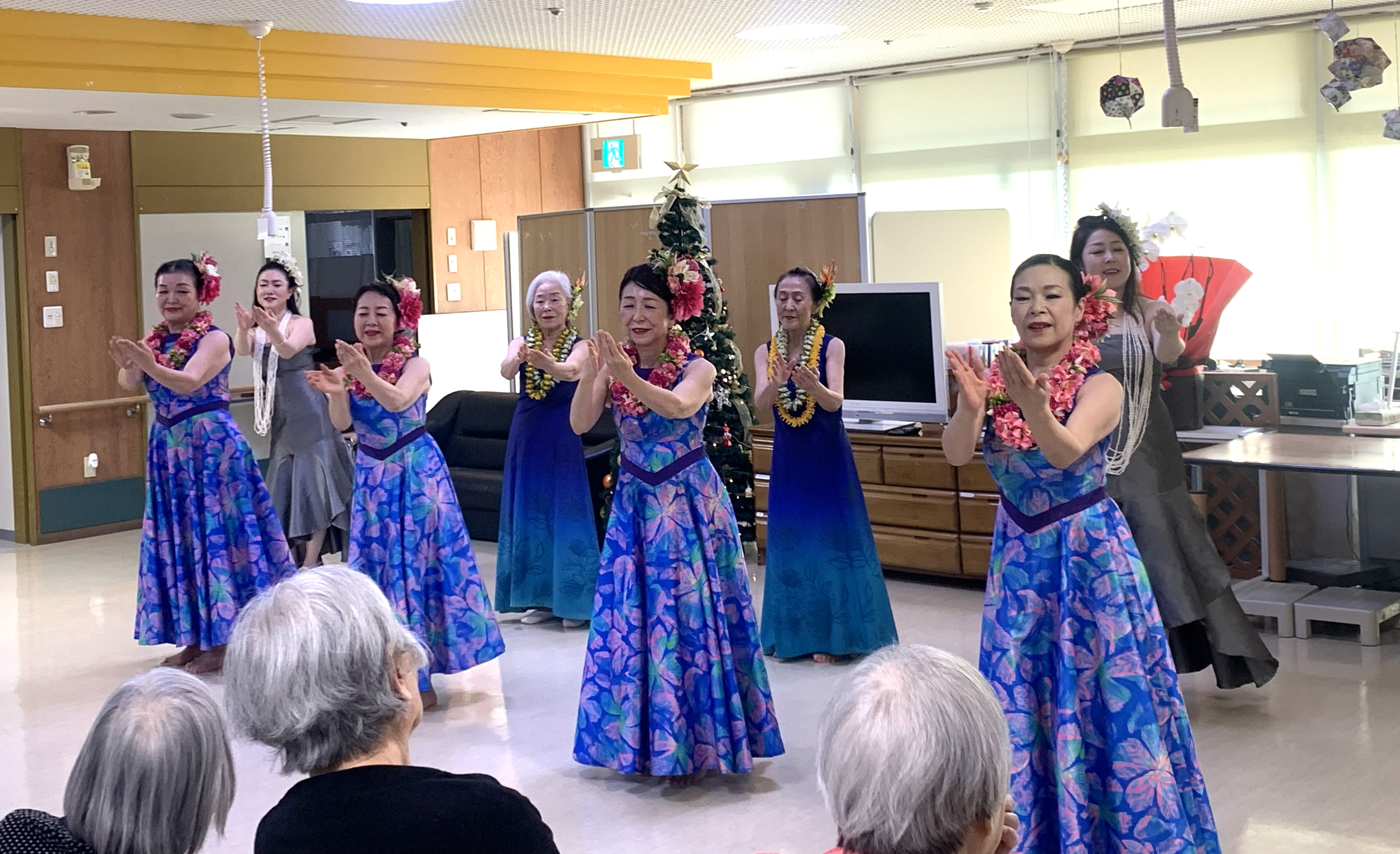 2025年11月25日、以前より縫物のボランティアで活動して頂いているN様のご紹介で、特養1階にて「マイレ本間フラスクール」の皆様が、稲寿園ではじめてフラダンスを披露してくださいました(N様もスクールに参加されており当日踊って頂けました)