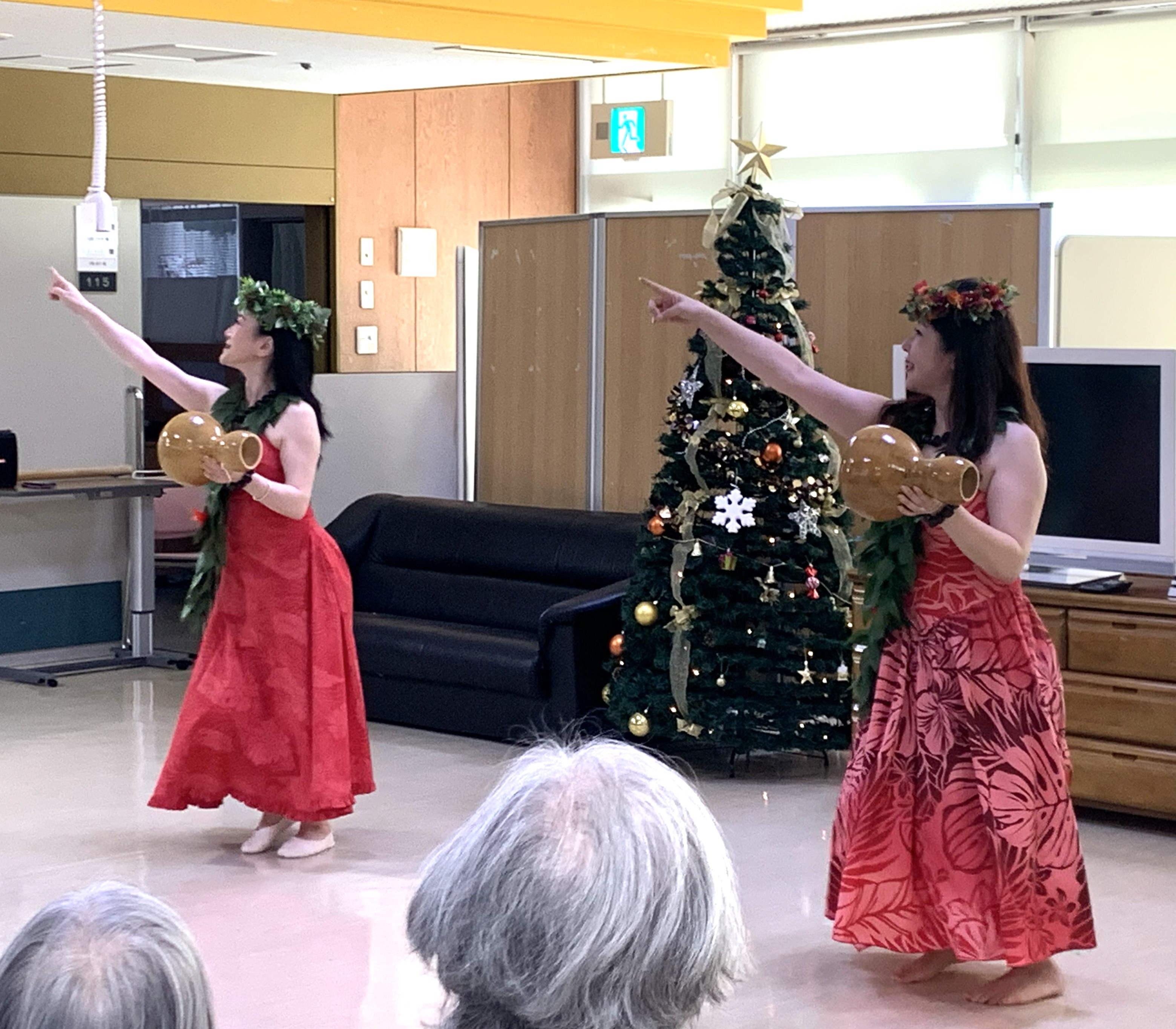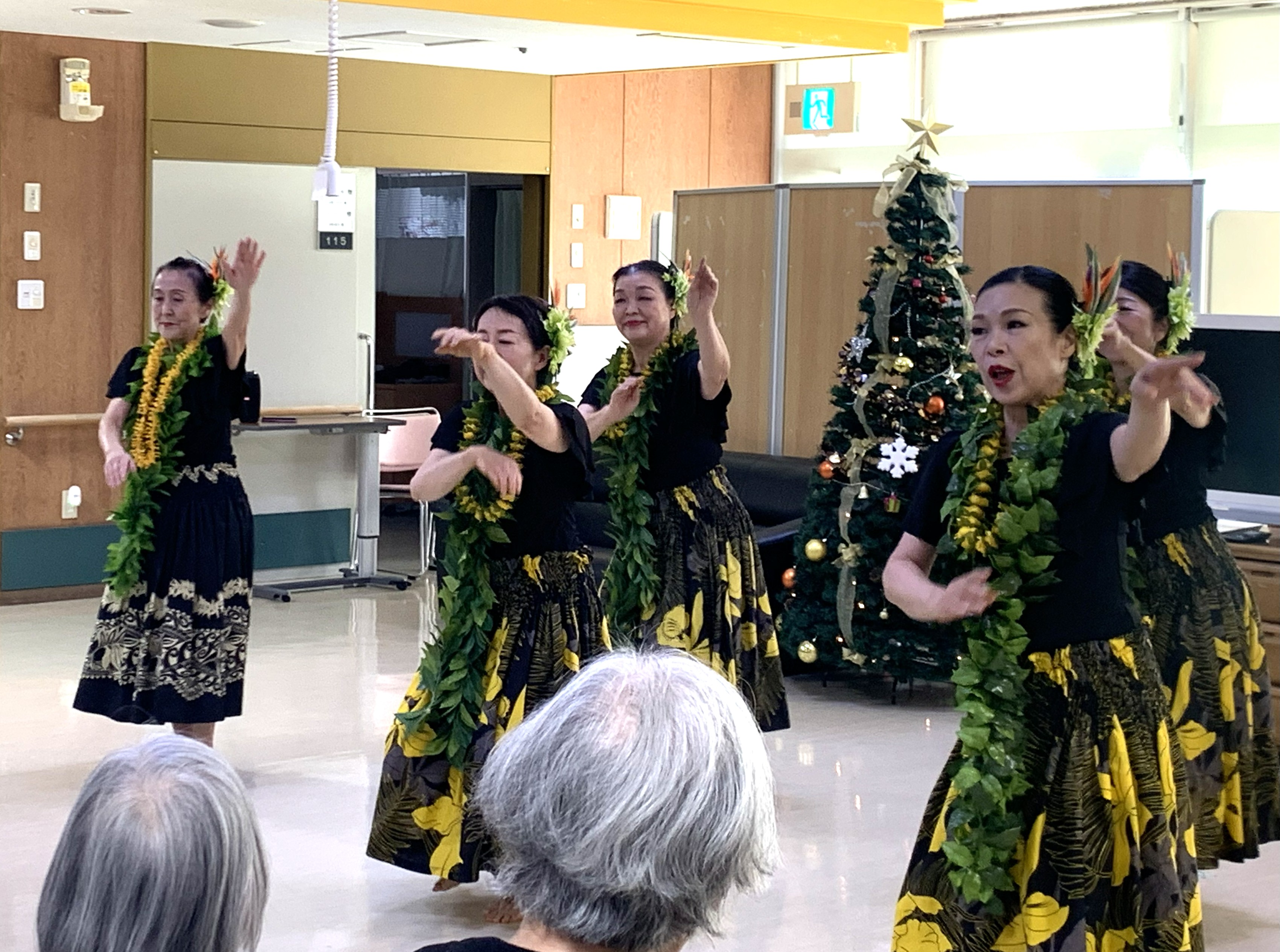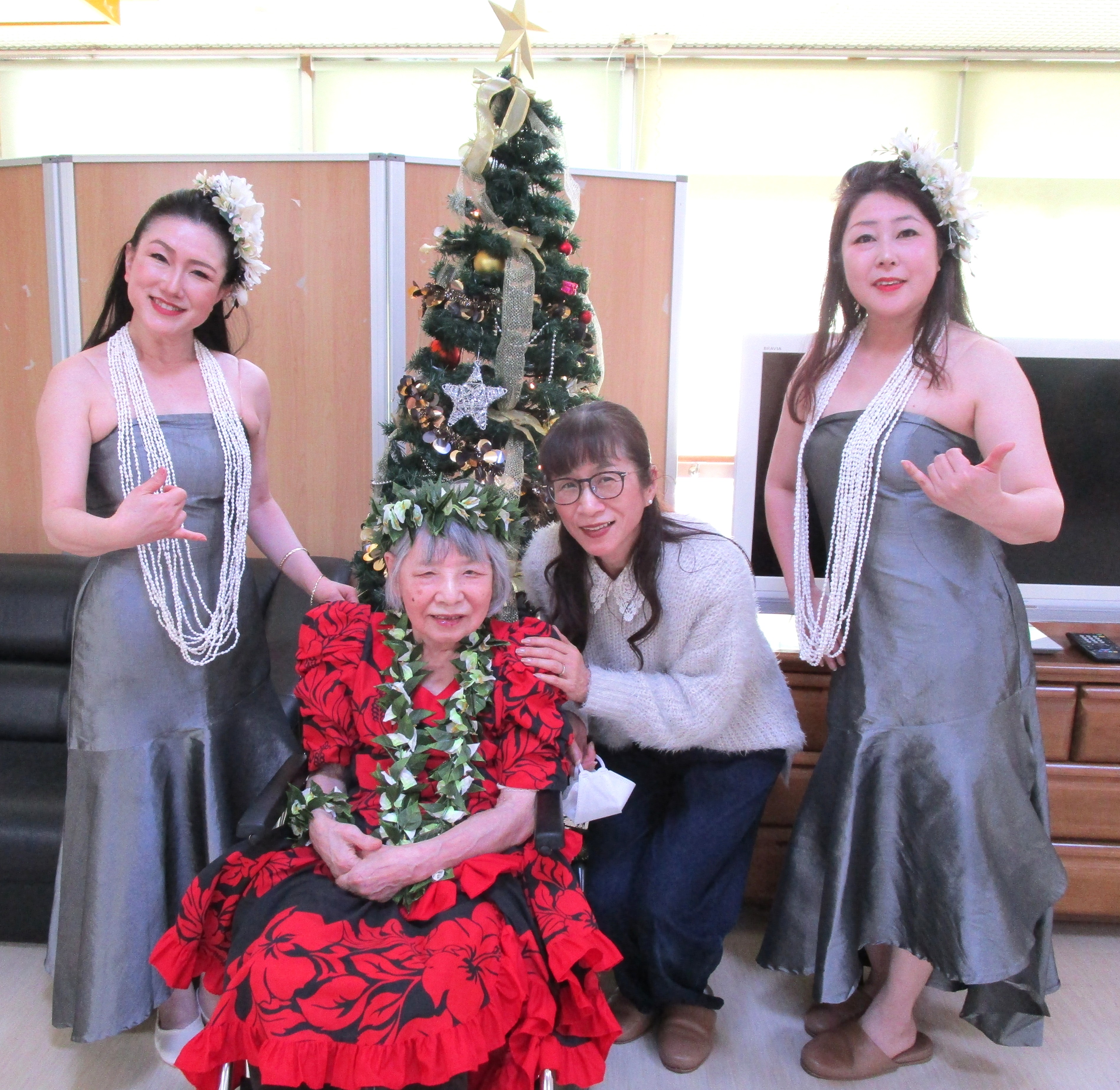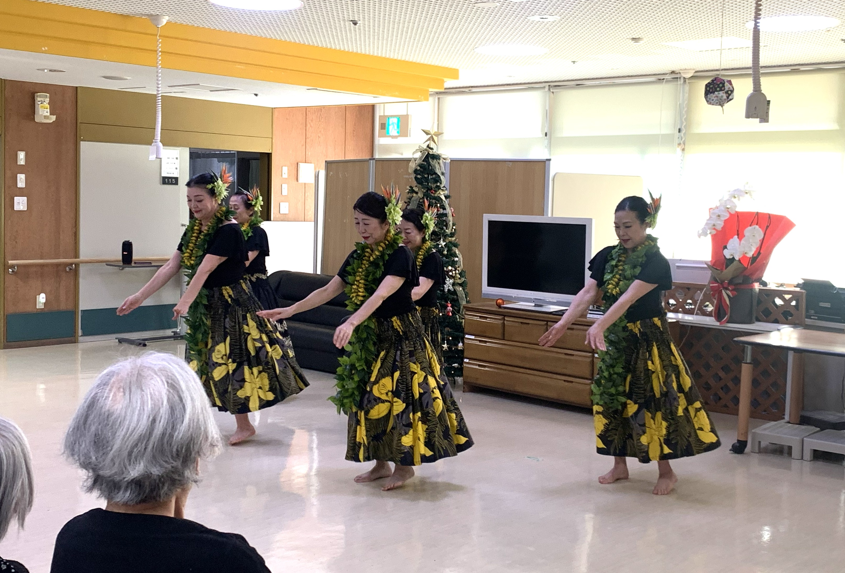 2025年11月25日、以前より縫物のボランティアで活動して頂いているN様のご紹介で、特養1階にて「マイレ本間フラスクール」の皆様が、稲寿園ではじめてフラダンスを披露してくださいました(N様もスクールに参加されており当日踊って頂けました)