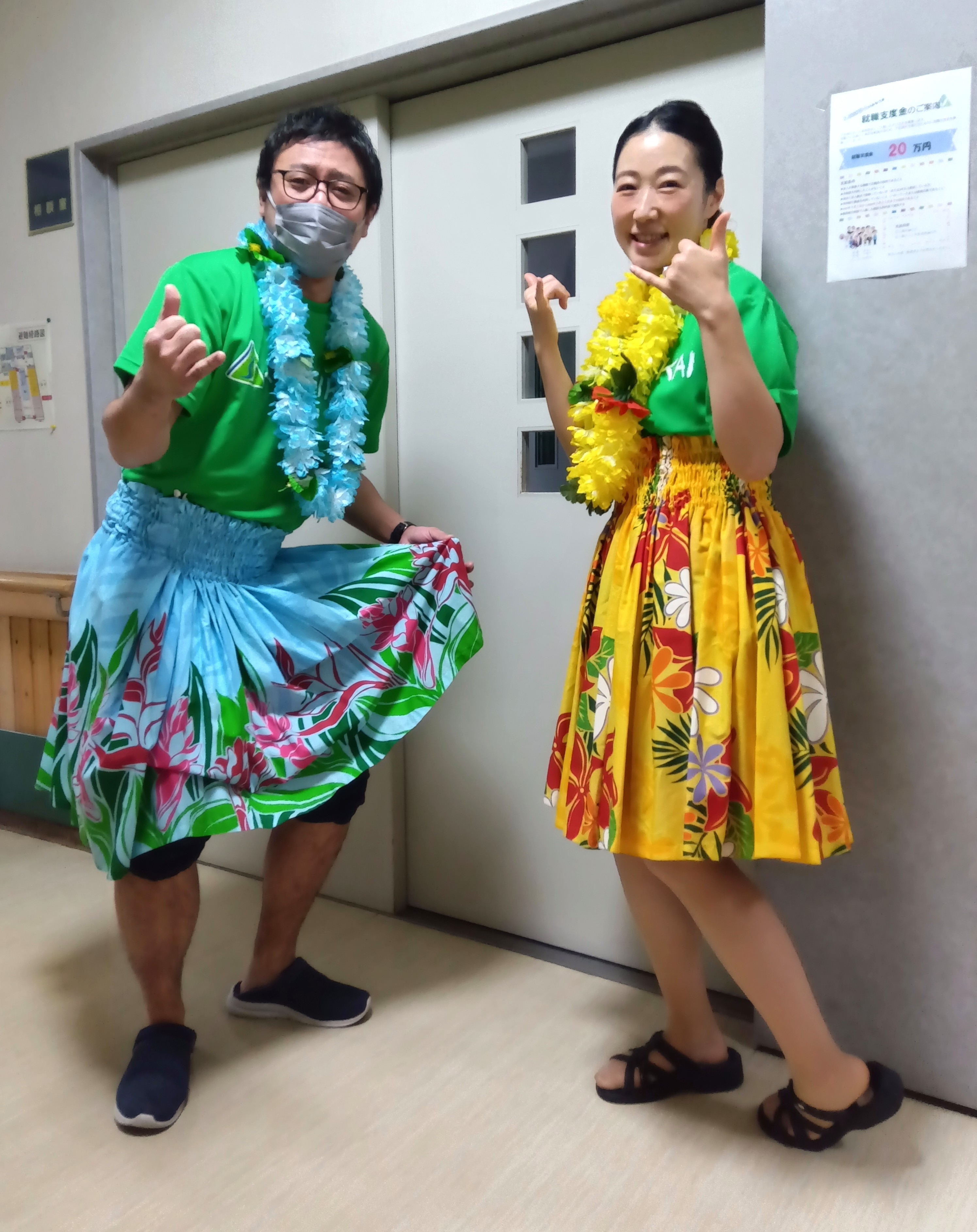 この日は、他のボランティア様も起こしくださり、温かい応援の中での開催となりました。職員もご好意で衣装をお借りし、踊れない私たちでも“踊れた気分”になれる楽しいひとときでした🌴
