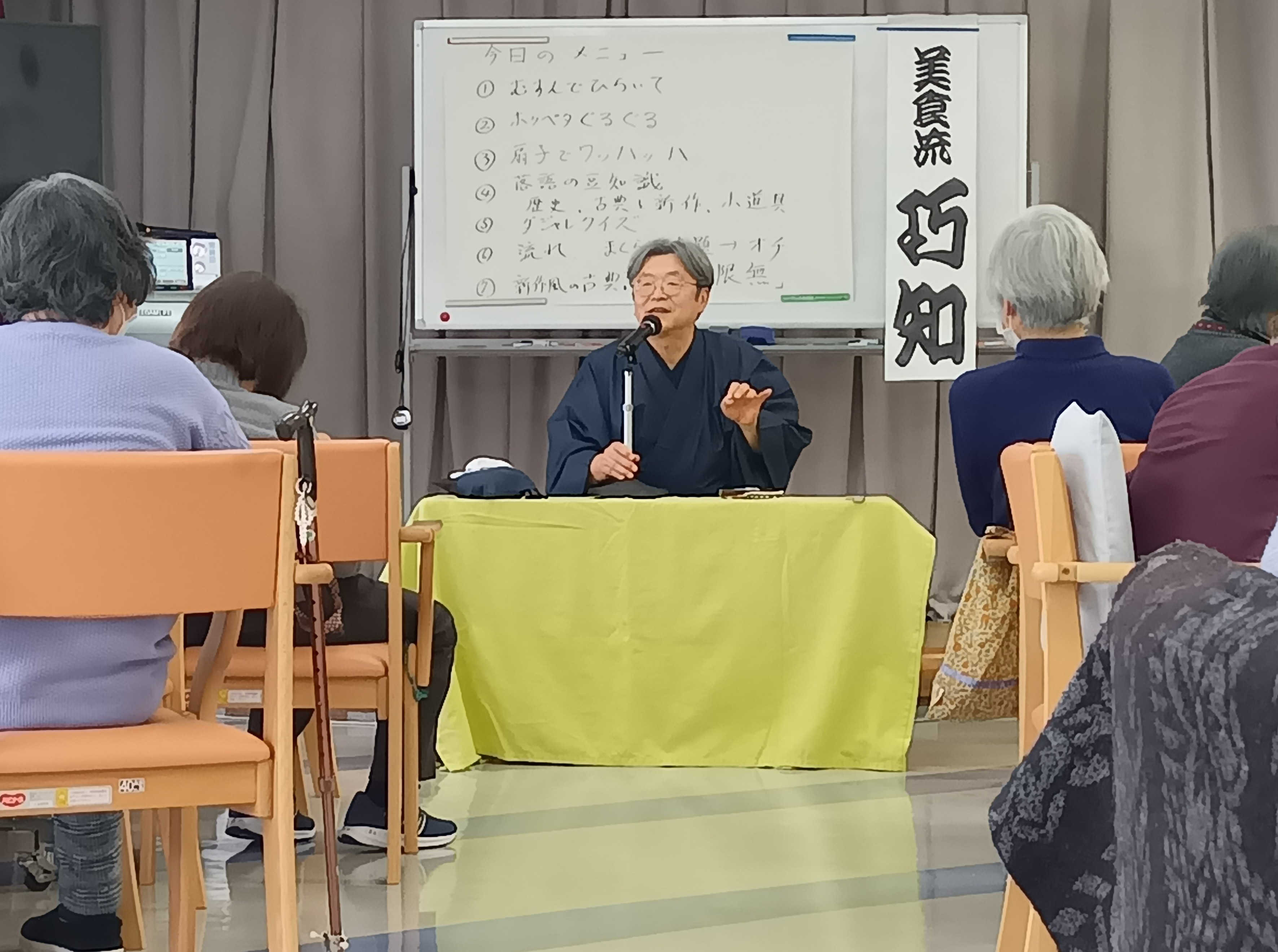 先日、デイサービスにて落語ボランティアの美食流巧知(ビジョクリコーチ)さんをお迎えしました。